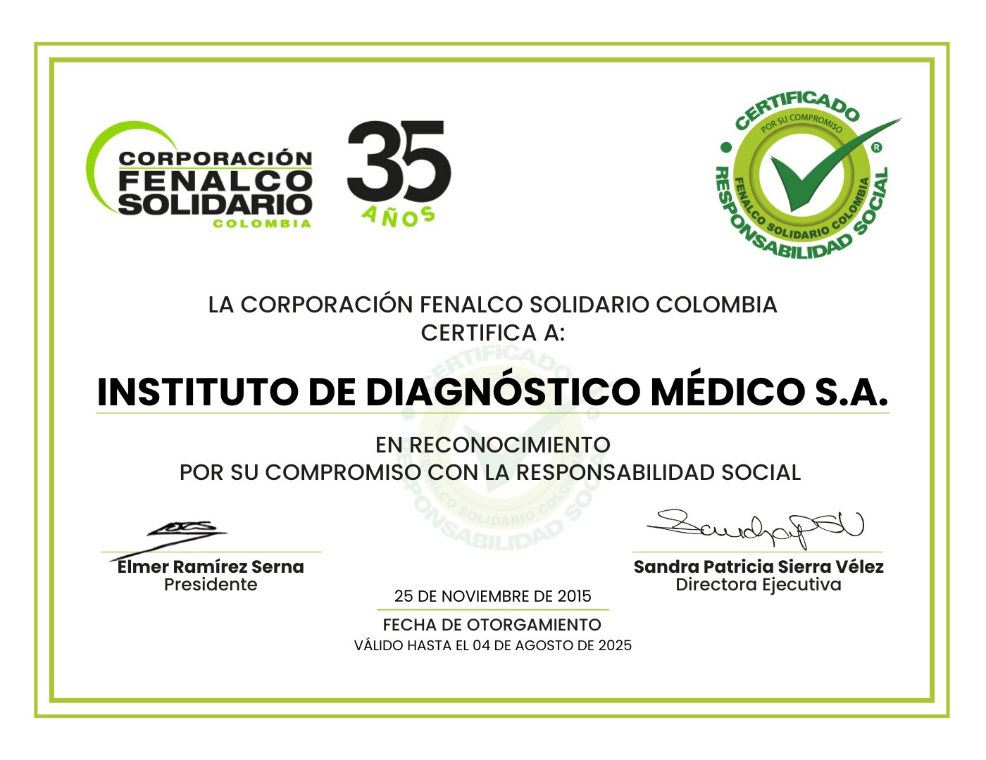 Concepto: La Corporación Fenalco Solidario Colombia otorga el Certificado en Responsabilidad Social a IDIME S.A. por el compromiso que tenemos con la sociedad y el planeta, demostrado en los 8 ejes (medio ambiente, estado, comunidad y sociedad, clientes y consumidores, proveedores, competencia, empleados y gobierno corporativo) con los que cuenta la evaluación de la corporación.